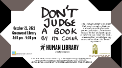 The Human Library is an event that aims to create a dialogue and understanding between people. Individuals volunteer as human "books," and participants at the event can "read" the book -- meaning they would share in a conversation about the "book's" experience. Light Refreshments will be served.