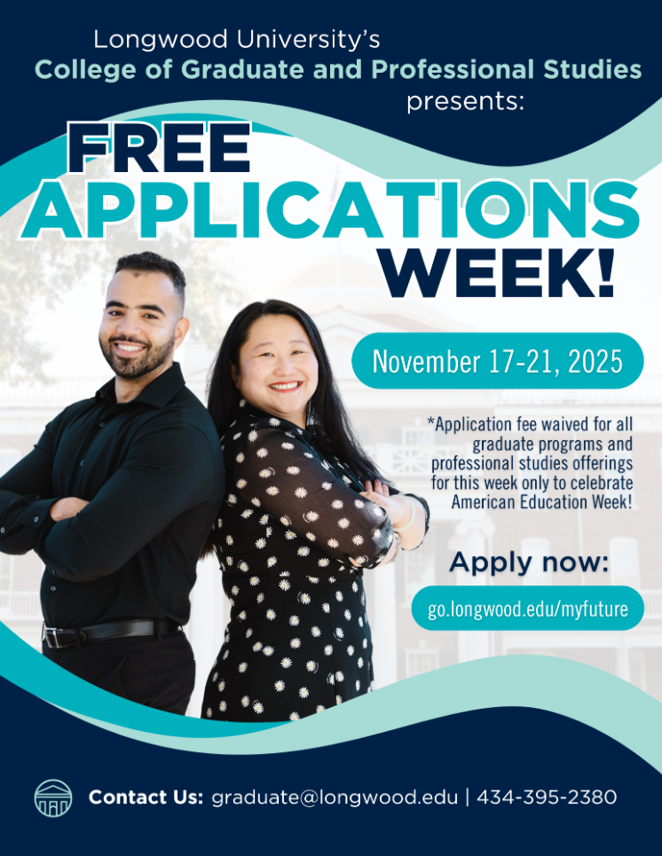 Free Applications Week is coming! Apply to any Longwood graduate or professional program Nov. 17–21.